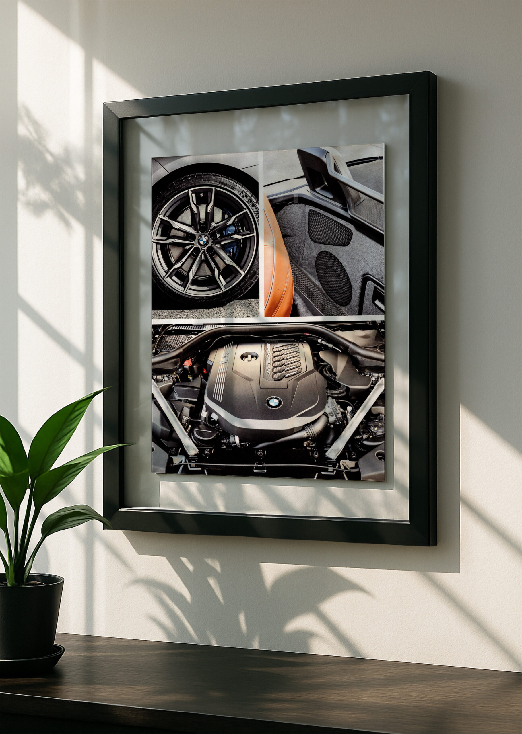 We pride ourselves in being the only producer of automotive art that will match any existing room set up. We accomplish this as the only seller of “floating frames” in the market- where there are only 2 glass panes surrounding the print. This way the wall or background behind the frame shows through, making it a seamless addition to the room.