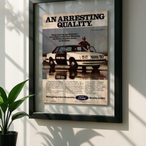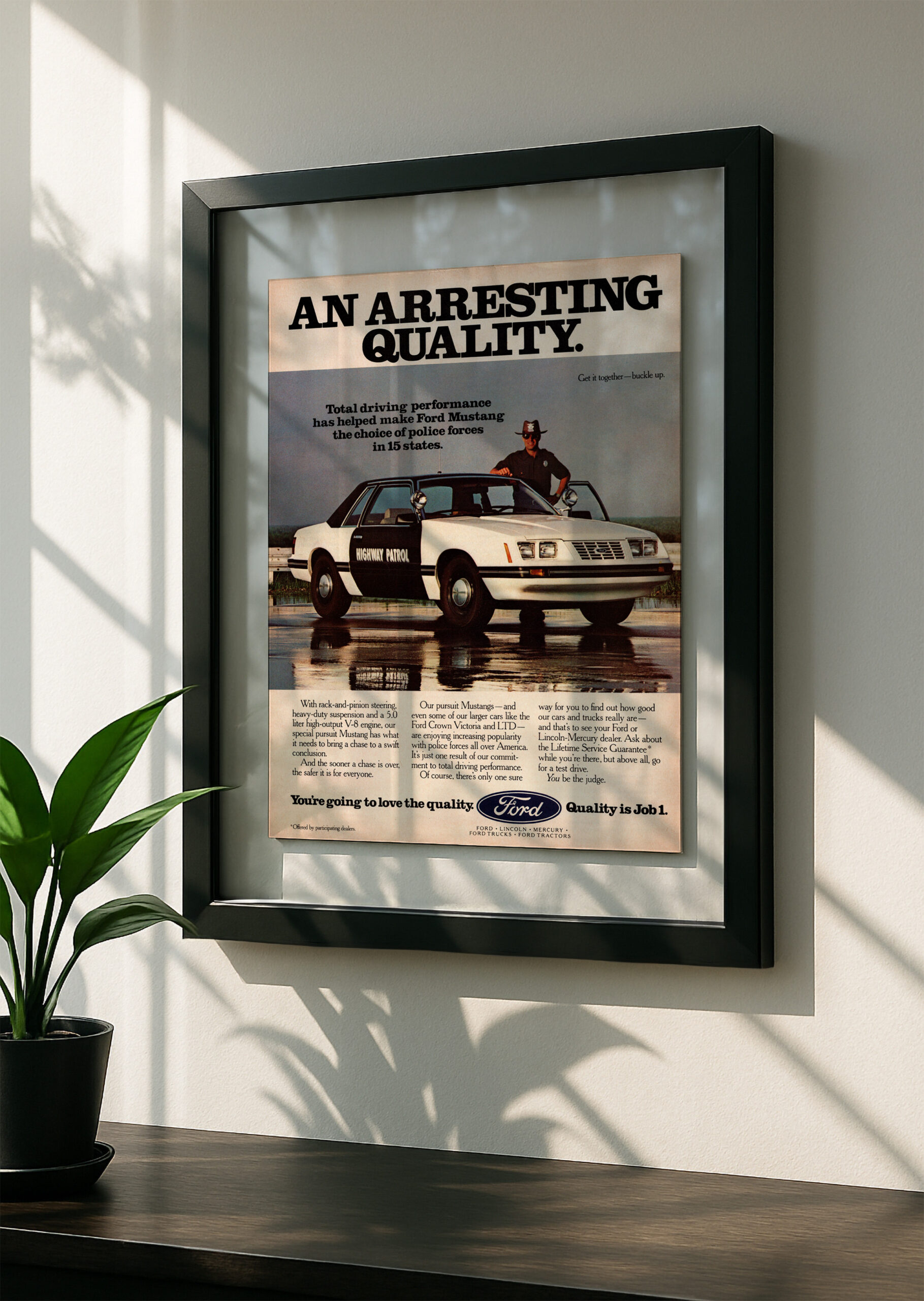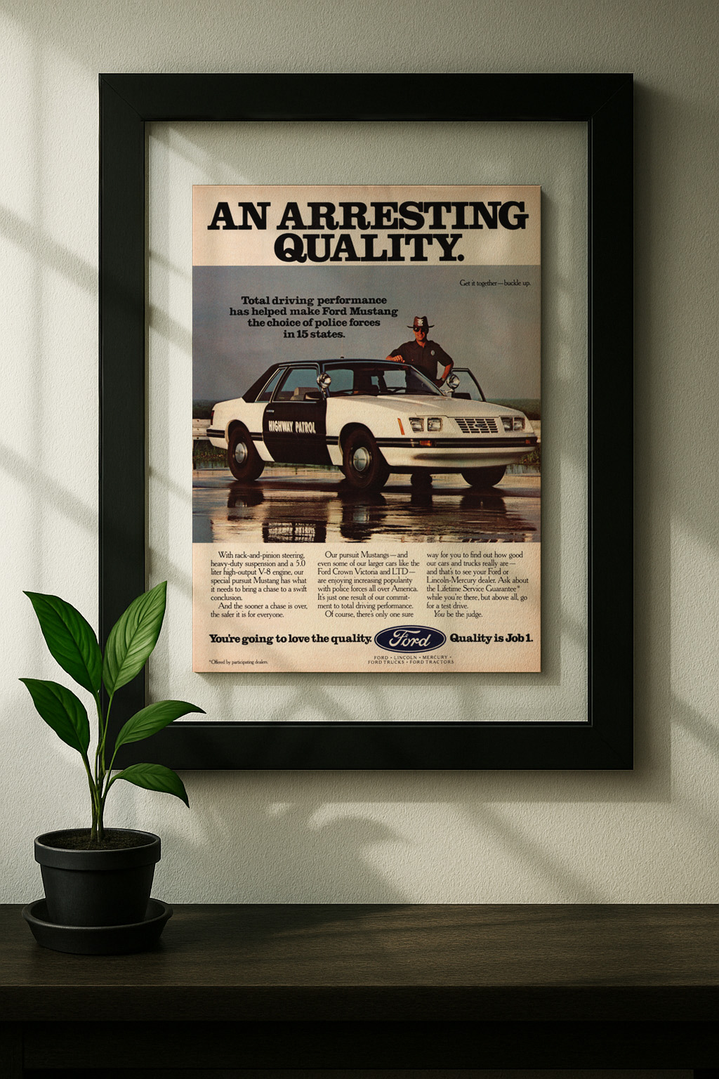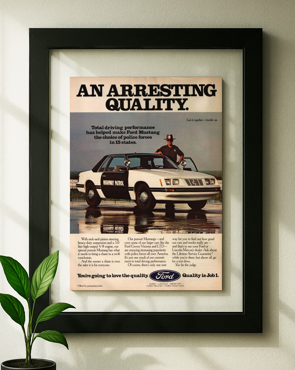 Ford mustang foxbody framed original ad in black floating frame on wallFord Mustang Highway Patrol